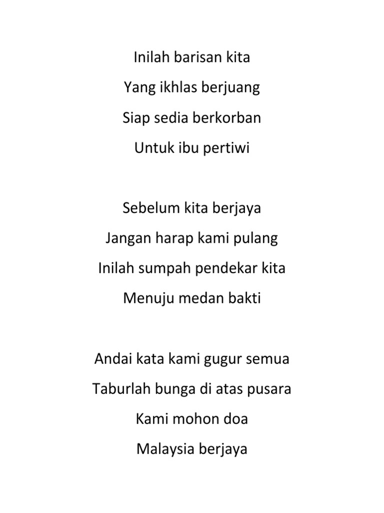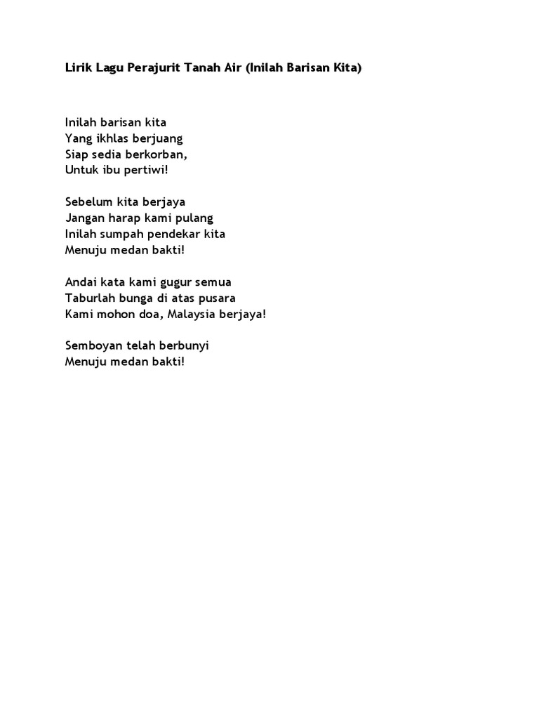 Lirik Lagu Inilah Barisan Kita Lagu Patriotik. Apa lagi yang kita tunggu bila sudah merasa oh whoa. Inilah Barisan Kita Lirik Inilah barisan kita Yang ikhlas berjuang Siap sedia berkorban Untuk ibu pertiwi Sebelum kita berjaya Jangan harap kami pulang Inilah sumpah pendekar kita Menuju medan bakti Andai kata kami gugur semua Taburlah bunga di atas pusara Kami mohon doa Malaysia berjaya.